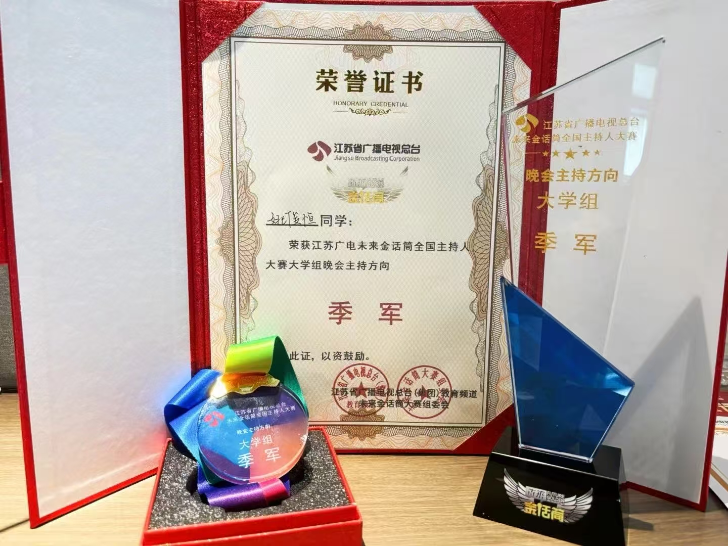 2024年江苏广电第十届“未来金话筒”主持人大赛的领奖台上,姚俊恒手握全国季军奖杯,声音微颤却透着坚定:“二本院校的学生,同样能站上行业的顶峰!” 此前,他曾因学校标签而自我怀疑,认为自己不过是名校学生的“陪跑者”,内心的迷茫与不安如影随形。然而,在华珠两年的学习与实践中,他逐渐明白“平台虽有高下之分,但个人的努力才是不二法门”。“我一直以为二本院校的播音学生不可能比得过其他一线艺术类大院的,但通过学习与实践,我居然超越了许多来自名校的优秀学生。”
