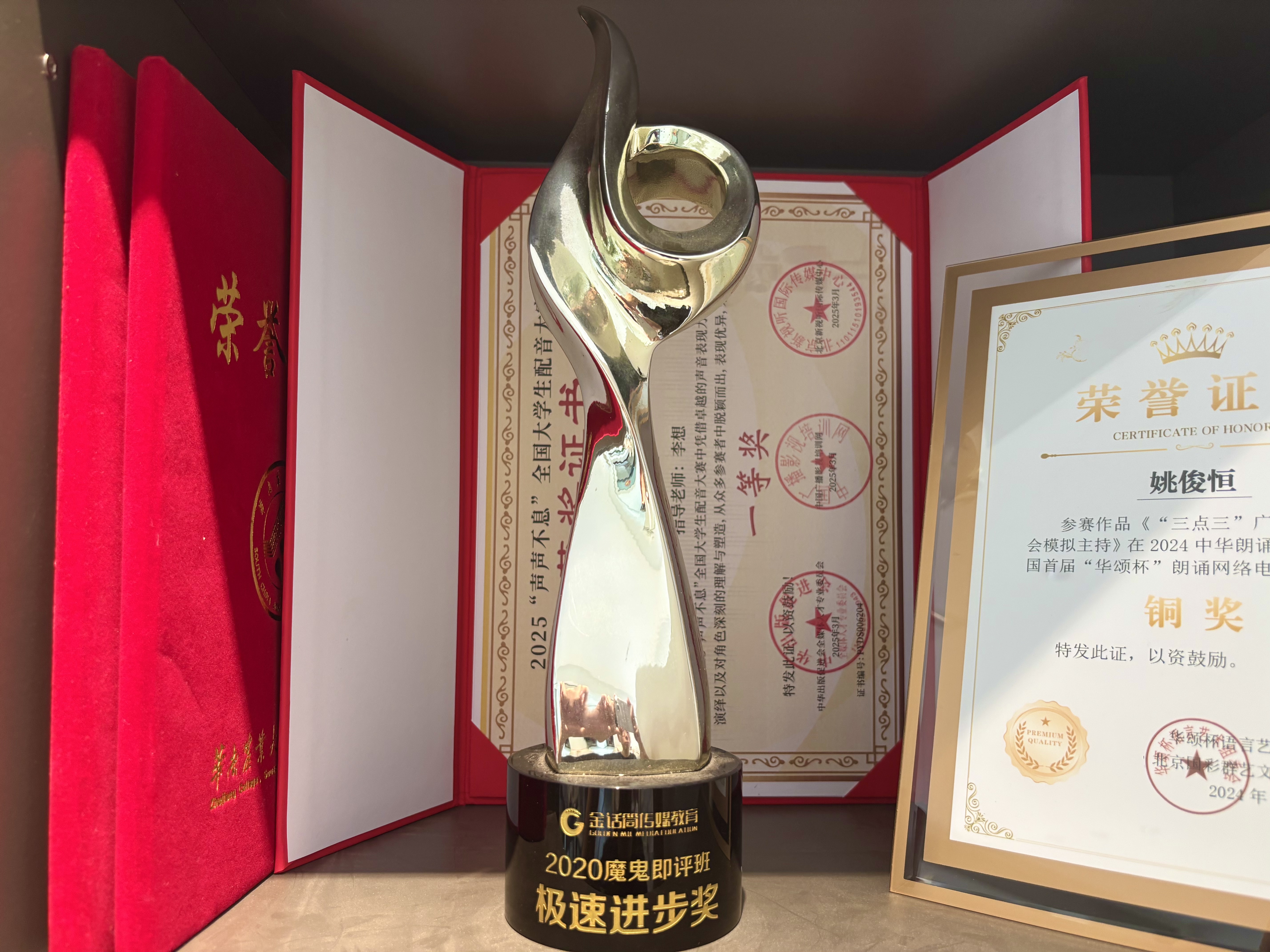 “艺考机构颁发的‘即兴评述极速进步奖’,是我播音主持路上的第一个奖项。” 从磕磕绊绊到流畅自如,他用两年时间完成了从青涩到自信的蜕变。这背后,是他无数个日夜的辛勤付出与不懈努力。他说:“天赋或许能敲门,但努力才是推开门的钥匙。” 这段经历不仅夯实了他的播音基础,更让他深刻领悟到坚持的力量。他明白,在追求梦想的道路上,唯有持之以恒,方能抵达彼岸。