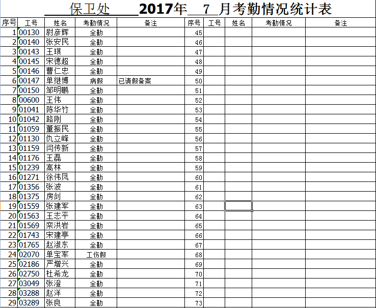 保卫处2017.7月考勤统计表